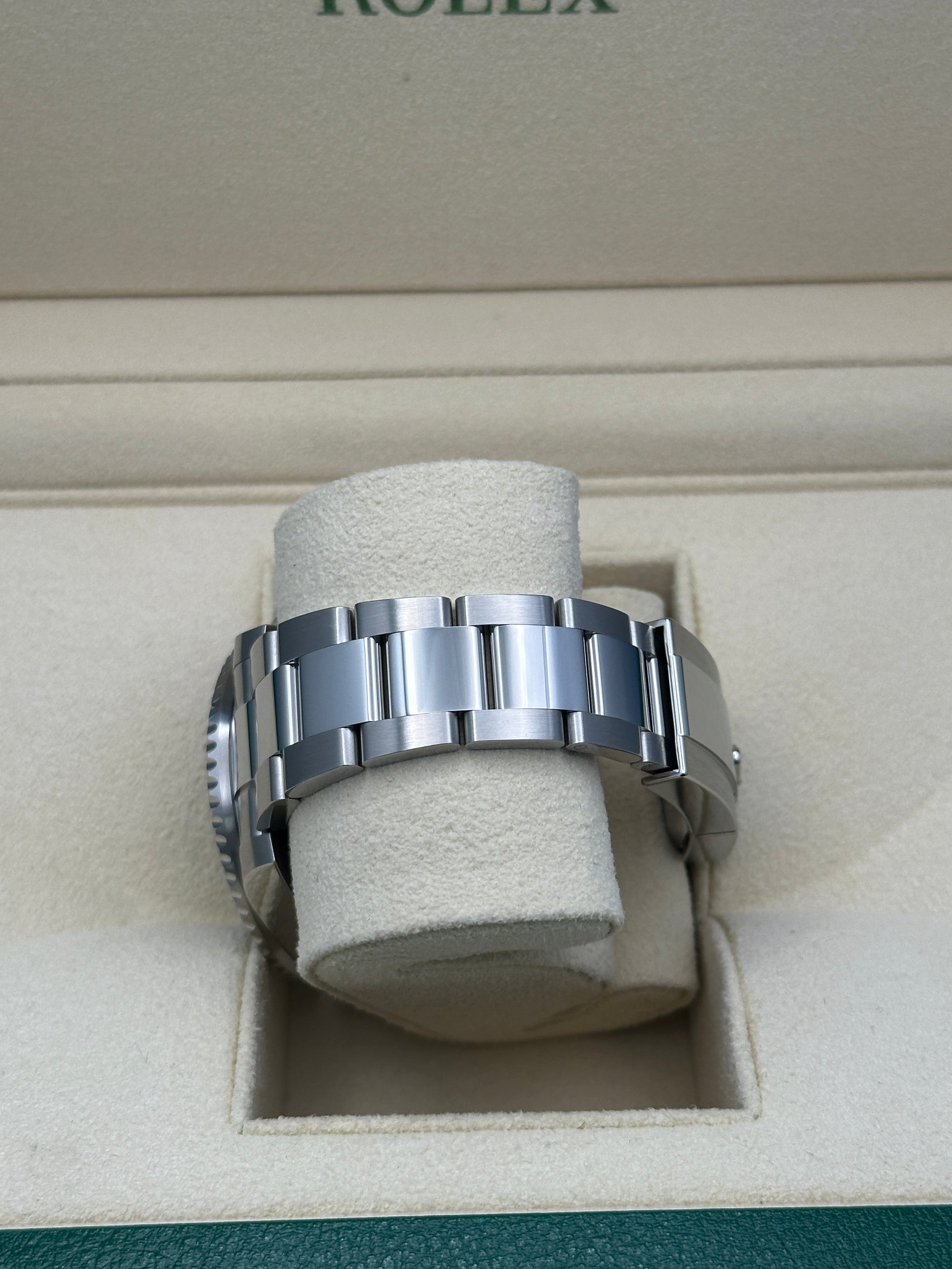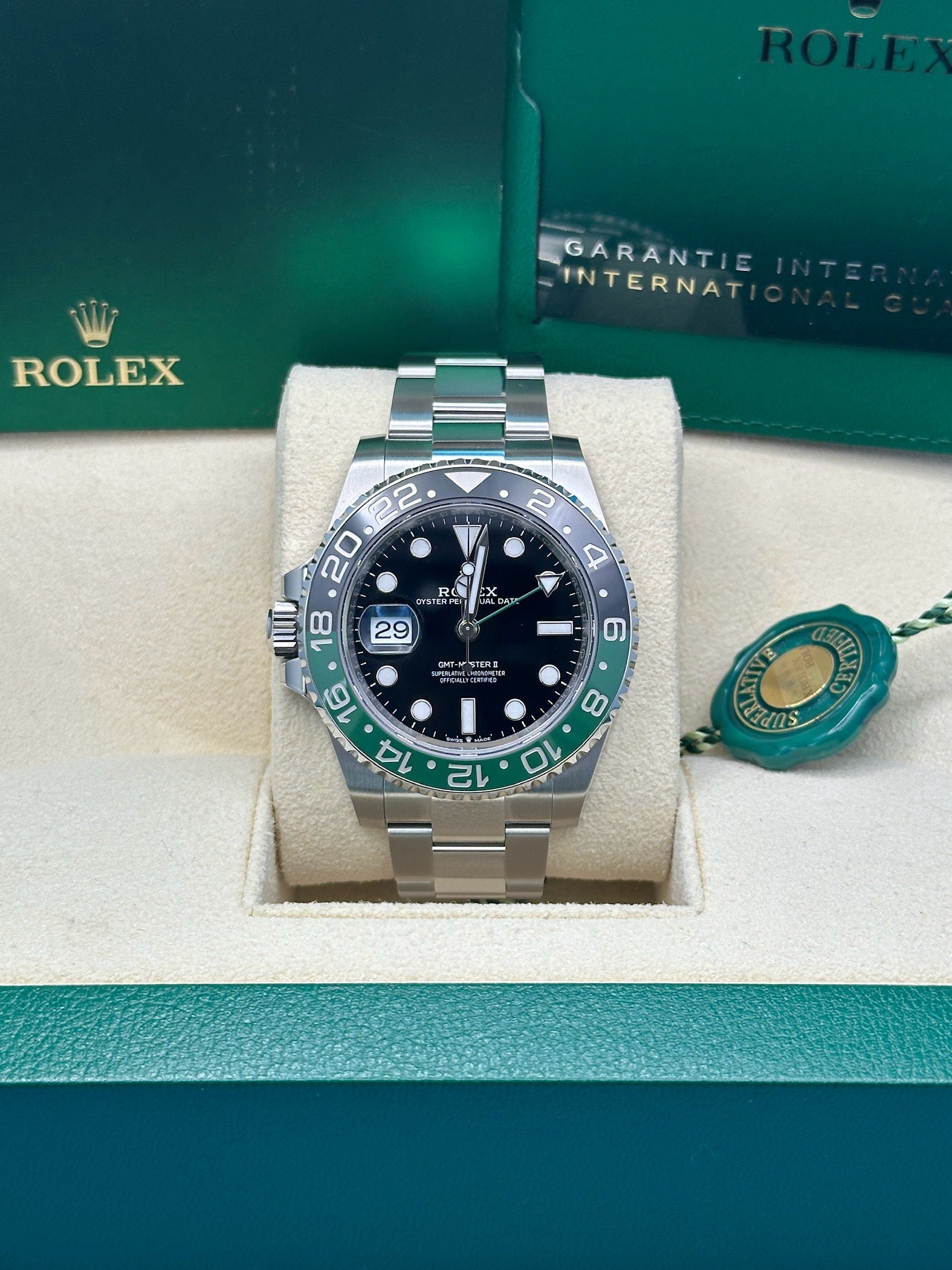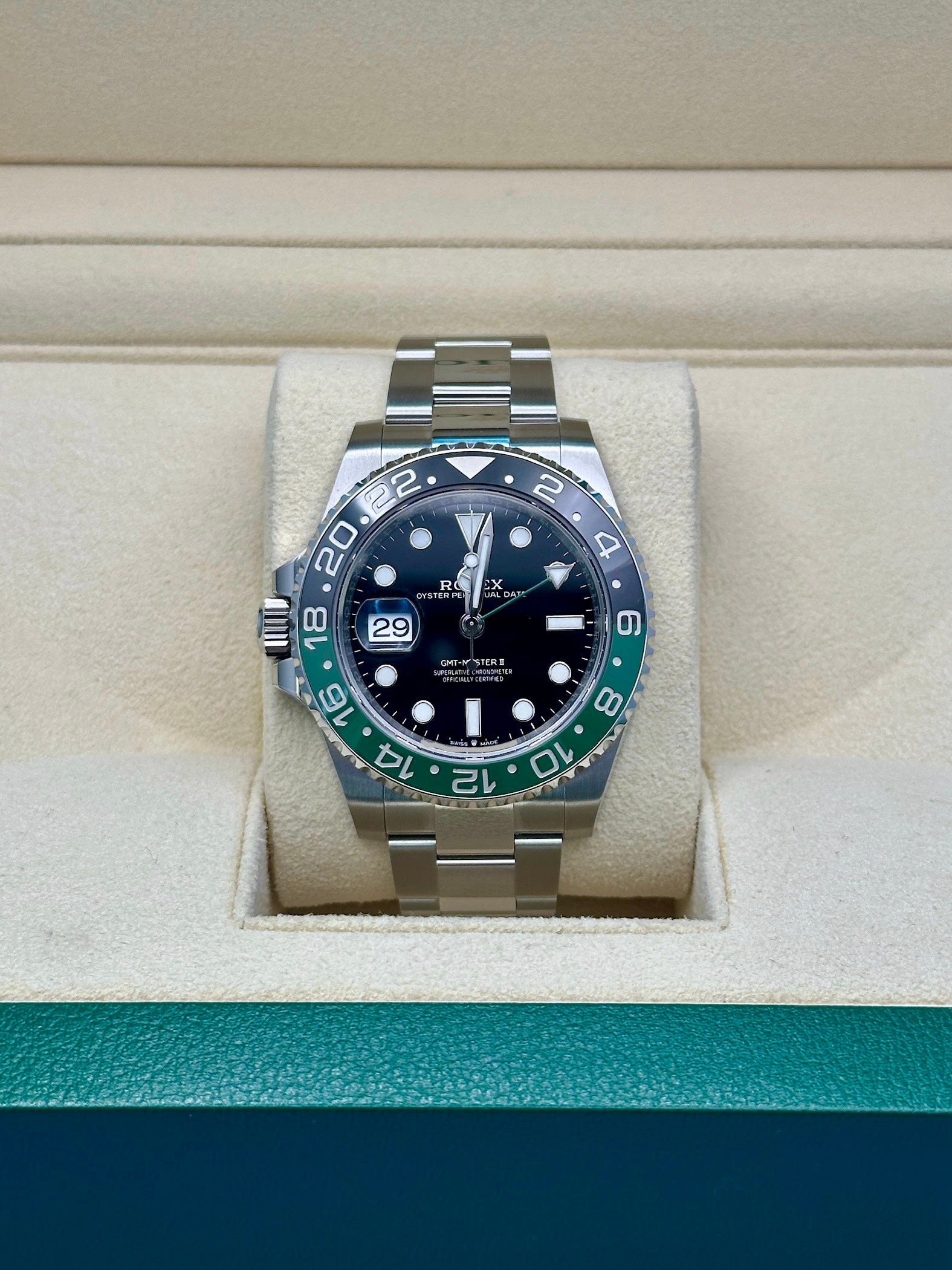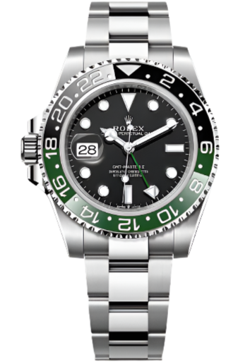 Two-Colour Green And Black Cerachrom Insert In Ceramic, Moulded Numerals And Graduations Bezel - Black Dial - Oyster Bracelet. 40mm Oystersteel case, screw-down back, screw-down crown with triplock triple waterproofness system, bidirectional rotatable 24-hour graduated bezel. two-colour green and black cerachrom insert in ceramic, moulded numerals and graduations bezel, scratch-resistant sapphire crystal with cyclops lens over the date, black dial, Rolex calibre 3285 perpetual self-winding, gmt function movement with centre hour, minute and seconds hands, 24-hour display, second time zone with independent rapid-setting of the hour hand, instantaneous date, and stop-seconds for precise time setting, approximately 70 hours of power reserve, Oyster bracelet with five-piece links, folding Oysterlock safety buckle with Easylink 5mm comfort extension link. Waterproof to 100 metres / 330 feet.