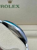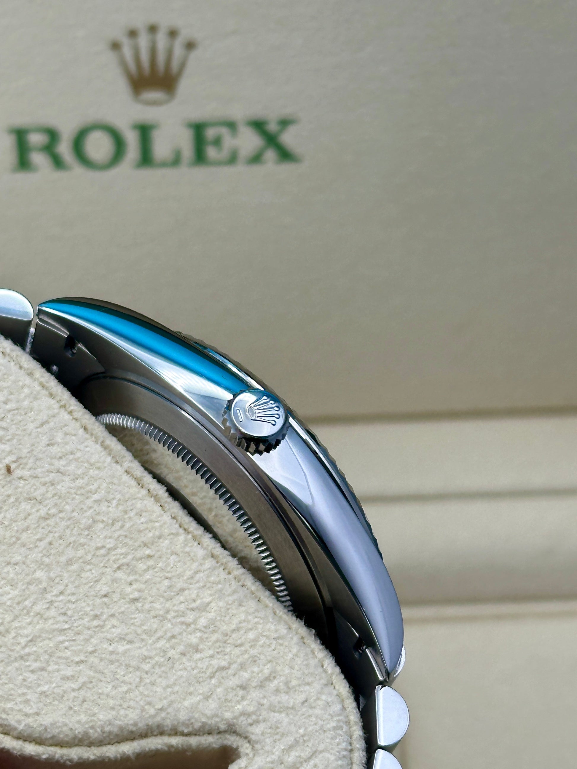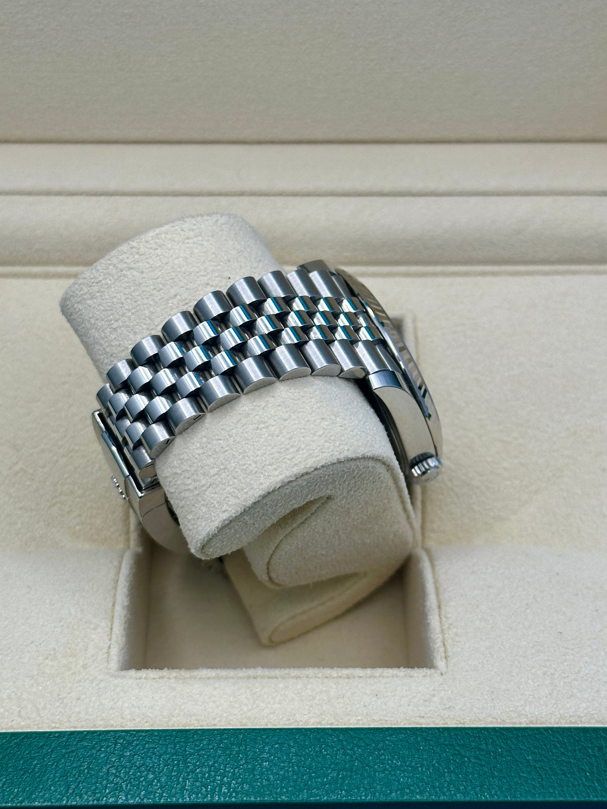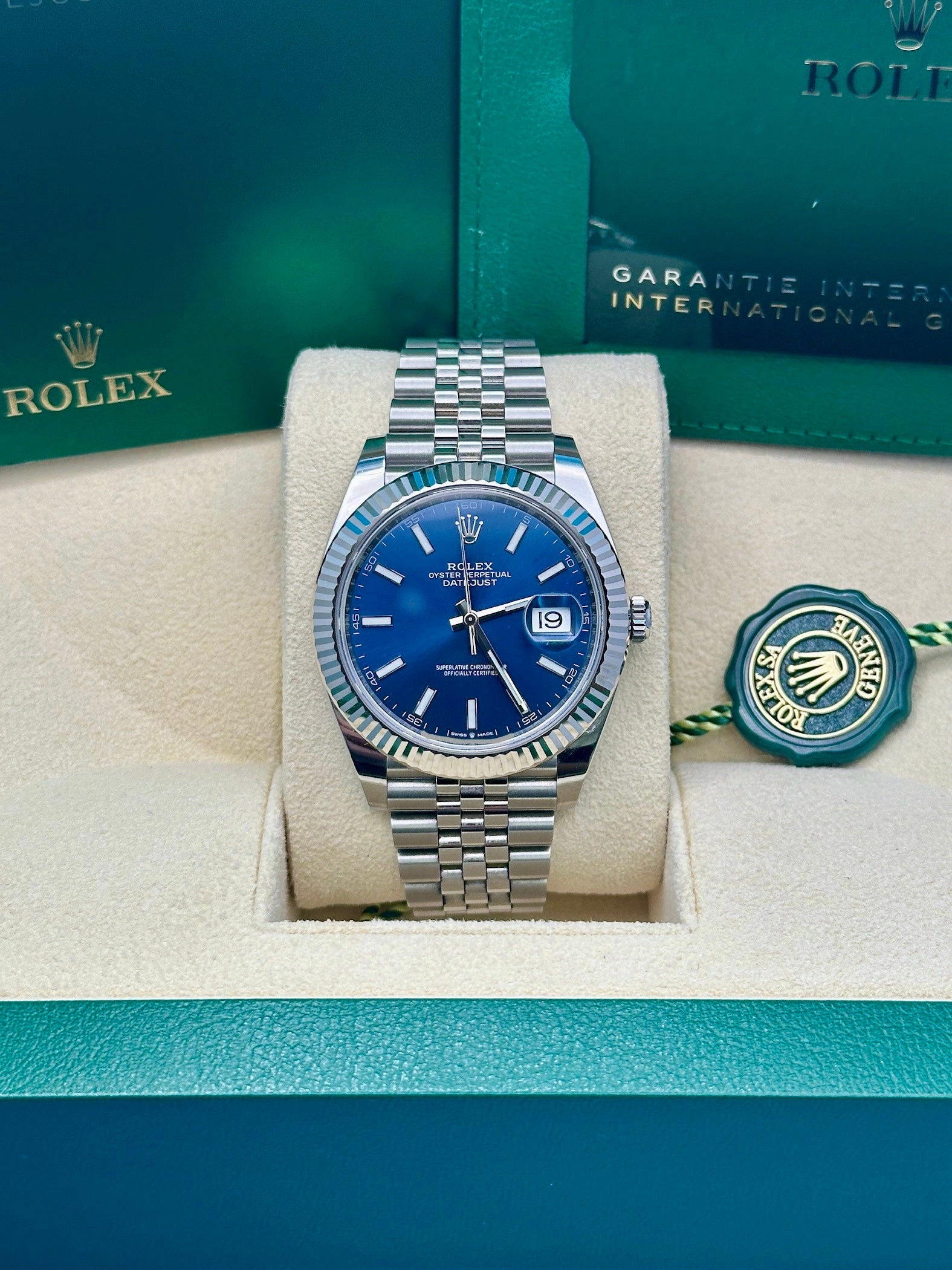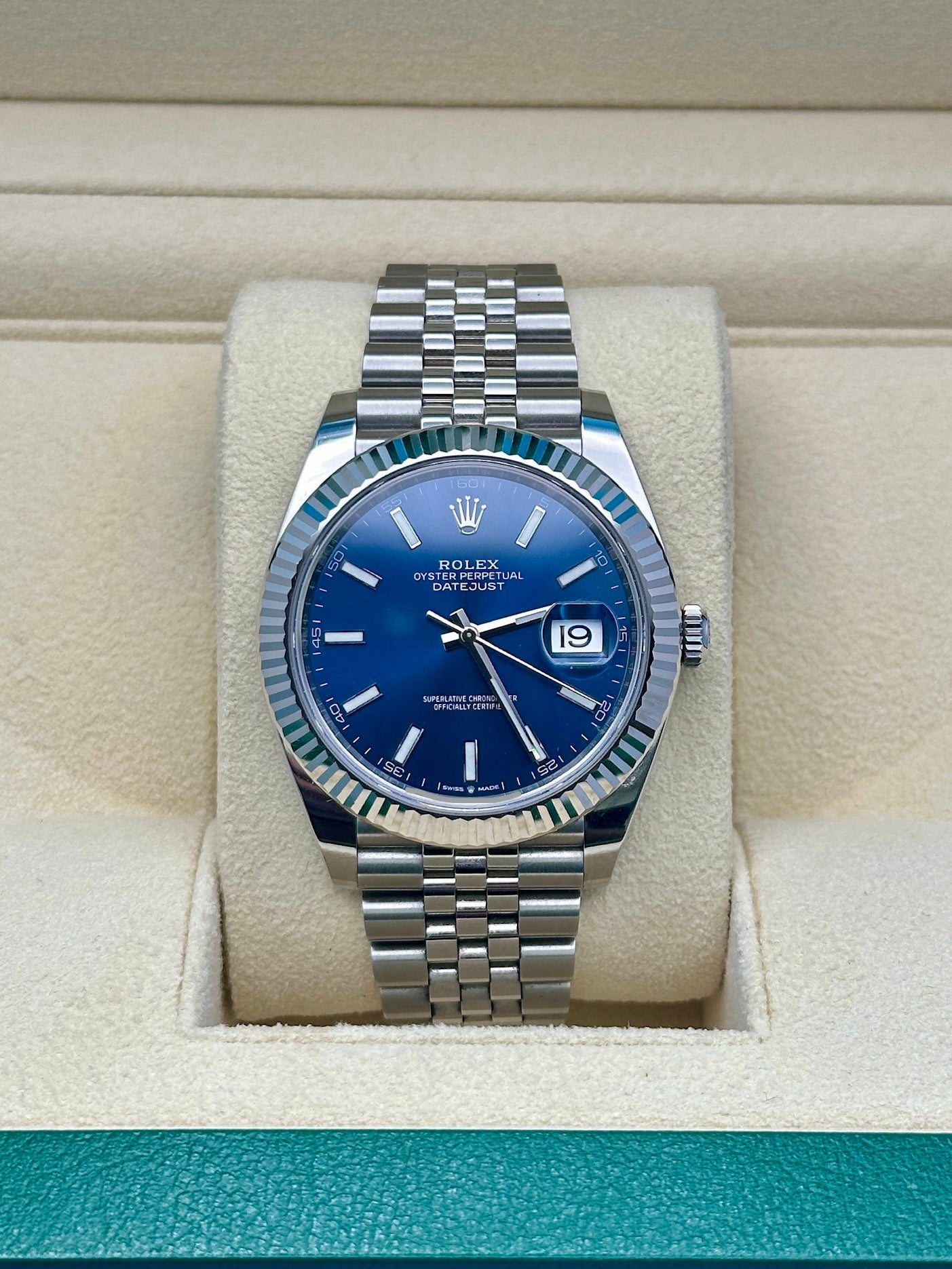 41mm white Rolesor case comprised of a 904L steel monobloc middle case, screw-down steel back, screw-down crown with twinlock double waterproofness system, 18K white gold fluted bezel, scratch-resistant double anti-reflective sapphire crystal with cyclops lens over the date, blue dial, index hour markers, Rolex calibre 3235 perpetual self-winding movement with date at 3 o'clock that changes instantaneously at midnight in a few thousandths of a second, approximately 70 hours of power reserve, 904L steel Jubilee bracelet with five-piece links, folding Oysterclasp buckle with Easylink 5mm comfort extension link. Waterproof to 100 meters.